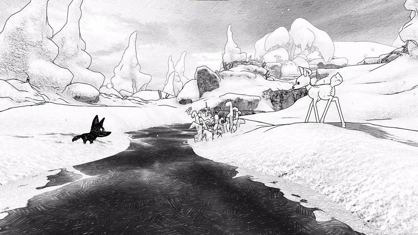 Blanc es una aventura cooperativa en la que un jugador maneja a un cervatillo y otro a un lobezno que necesitan encontrar el camino a casa. Tras una tormenta de nieve que los aleja de los suyos, se encuentran y, tras una desconfianza entre extraños, surge un vínculo especial entre ellos. Su paleta es monocromática, en un blanco y negro precioso e invernal, y es una historia cortita para finiquitársela en una tarde fría. Su mensaje sobre el amor y abrazar las diferencias del otro es bastante tierno.